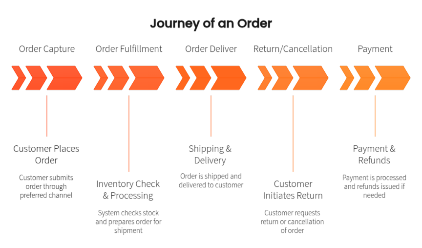 Typical order flow or journey looks like below and the questions that can be asked to understand order processing from the time it is placed for a better for an effective solution.